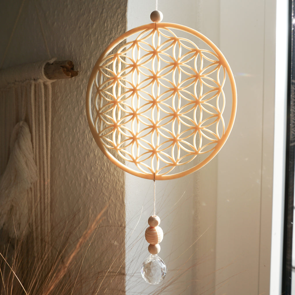 Dieser Sonnenfänger bringt positive Energie, Harmonie und Licht in jeden Raum. Noch einmal die Welt mit Kinderaugen sehen. Sobald die Sonne scheint und der Sonnenfänger die Strahlen einfängt passiert etwas in uns. Wir bleiben kurz stehen, lassen den Alltag langsamer laufen und genießen die bunten Regenbogenfarben, die sich im Raum verteilen. Ein Moment der Ruhe kehrt ein. Oben am Sonnenfänger hängt ein die Blume des Lebens, sie wird mit Hilfe modernster 3D Druck-Technologie hergestellt. In der Auswahl kannst du dich entscheiden, ob du die Blume des Lebens wie abgebildet in beige willst oder aber auch in schwarz oder weiß für einen zeitlosen, minimalistischen Look. Durch zeitloses Design passt der Sonnenfänger zu jeder Einrichtung und kann überall aufgehängt werden.